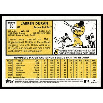 This is a 2022 Topps Archives Jarren Duran baseball card. The card is #88 and pictures show condition.