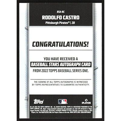 This is a 2022 Topps Baseball Stars Autographs Rodolfo Castro autographed baseball card. This card has been signed, in blue, by Rodolfo Castro, and is certified authentic by Topps. The card is #BSA-RC and pictures show condition.