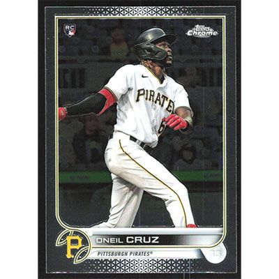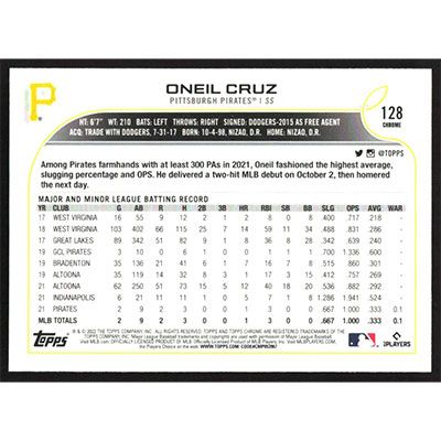 This is a 2022 Topps Chrome Oneil Cruz baseball card. The card is #128 and pictures show condition.