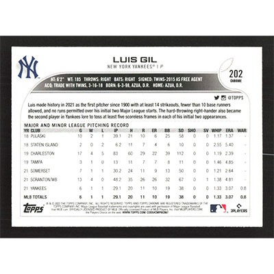 This is a 2022 Topps Chrome Luis Gil baseball card. The card is #202 and pictures show condition.