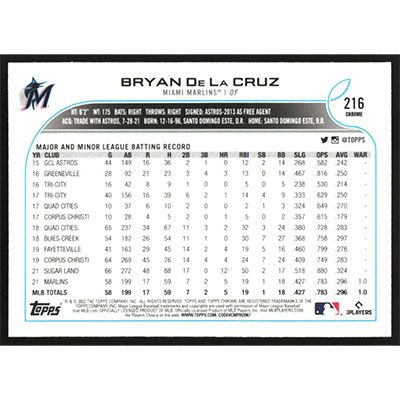 This is a 2022 Topps Chrome Bryan De La Cruz baseball card. The card is #216 and pictures show condition.