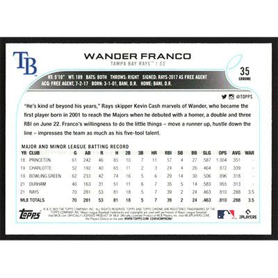 This is a 2022 Topps Chrome Wander Franco baseball card. The card is #35 and pictures show condition.