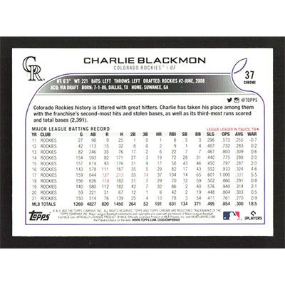 This is a 2022 Topps Chrome Charlie Blackmon baseball card. The card is #37 and pictures show condition.