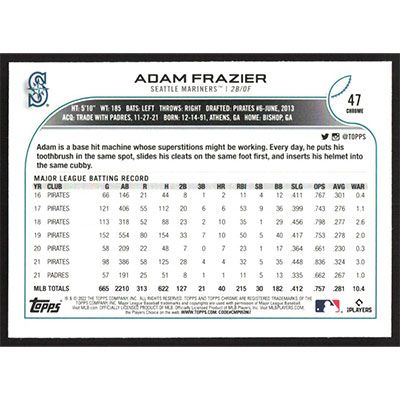 This is a 2022 Topps Chrome Adam Frazier baseball card. The card is #47 and pictures show condition.