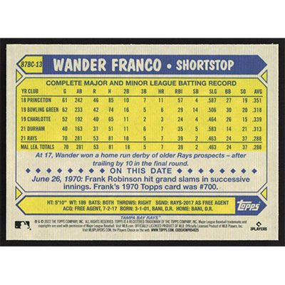 This is a 2022 Topps Chrome '87 Wander Franco baseball card. The card is #87BC-13 and pictures show condition. Team(s): Tampa Bay Rays Rookie Card (RC)