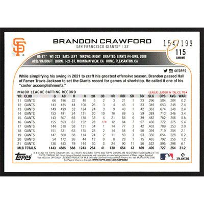 This is a 2022 Topps Chrome Aqua Mini-Diamond Refractors Brandon Crawford baseball card. The card is #115 and pictures show condition. This card is limited; #'d 154/199.
