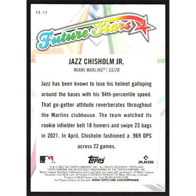 This is a 2022 Topps Chrome Future Stars Jazz Chisholm Jr. baseball card. The card is #FS-12 and pictures show condition.
