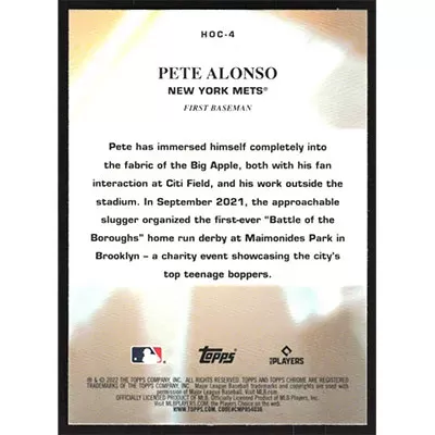 This is a 2022 Topps Chrome Heart of the City Pete Alonso baseball card. The card is #HOC-4 and pictures show condition.