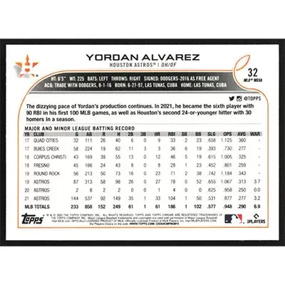 This is a 2022 Topps Chrome Logofractor Yordan Alvarez baseball card. The card is #32 and pictures show condition.