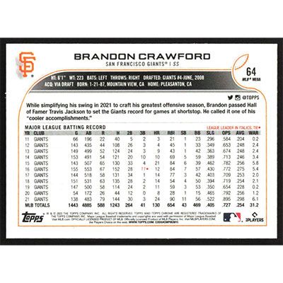 This is a 2022 Topps Chrome Logofractor Brandon Crawford baseball card. The card is #64 and pictures show condition.