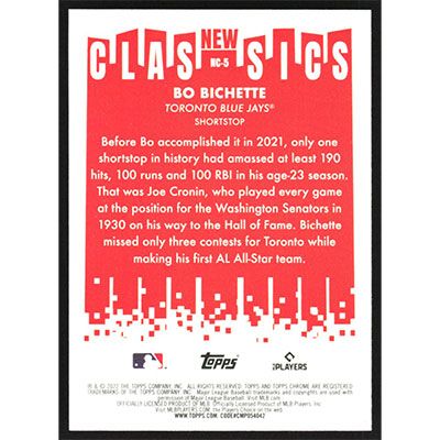 This is a 2022 Topps Chrome New Classics Bo Bichette baseball card. The card is #NC-5 and pictures show condition.