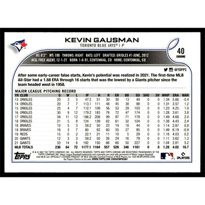 This is a 2022 Topps Chrome Pink Refractors Kevin Gausman baseball card. The card is #40 and pictures show condition.