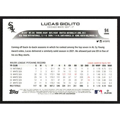 This is a 2022 Topps Chrome Pink Refractors Lucas Giolito baseball card. The card is #94 and pictures show condition.
