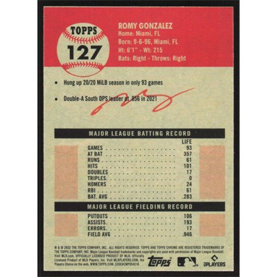 This is a 2022 Topps Chrome Platinum Anniversary Romy Gonzalez baseball card. The card is #127 and pictures show condition.