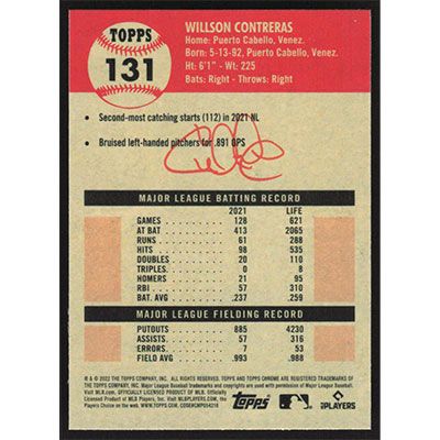 This is a 2022 Topps Chrome Platinum Anniversary Willson Contreras baseball card. The card is #131 and pictures show condition.
