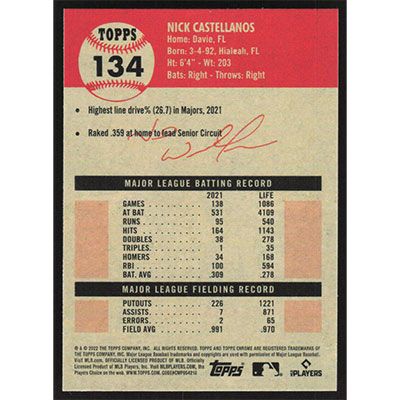 This is a 2022 Topps Chrome Platinum Anniversary Nick Castellanos baseball card. The card is #134 and pictures show condition. Team(s): Philadelphia Phillies
