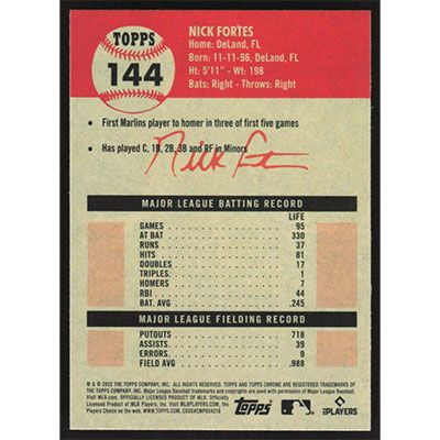 This is a 2022 Topps Chrome Platinum Anniversary Nick Fortes baseball card. The card is #144 and pictures show condition. Team(s): Miami Marlins Rookie Card (RC)