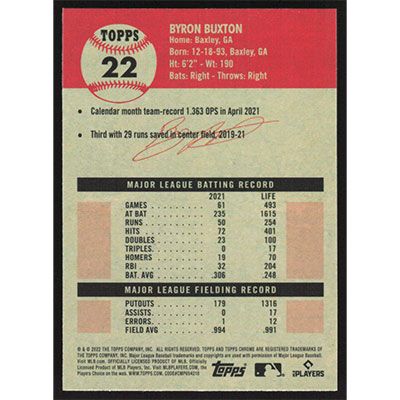 This is a 2022 Topps Chrome Platinum Anniversary Byron Buxton baseball card. The card is #22 and pictures show condition.