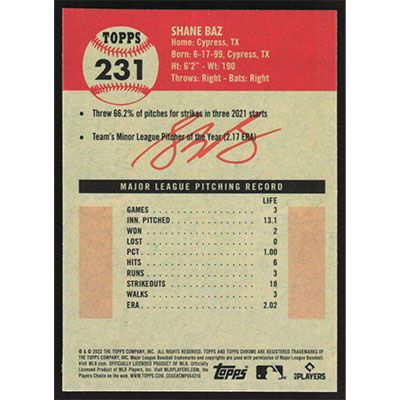 This is a 2022 Topps Chrome Platinum Anniversary Shane Baz baseball card. The card is #231 and pictures show condition. Team(s): Tampa Bay Rays Rookie Card (RC)