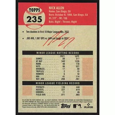 This is a 2022 Topps Chrome Platinum Anniversary Nick Allen baseball card. The card is #235 and pictures show condition. Team(s): Oakland Athletics Rookie Card (RC)