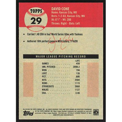 This is a 2022 Topps Chrome Platinum Anniversary David Cone baseball card. The card is #29 and pictures show condition.