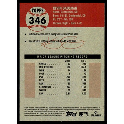 This is a 2022 Topps Chrome Platinum Anniversary Kevin Gausman baseball card. The card is #346 and pictures show condition.