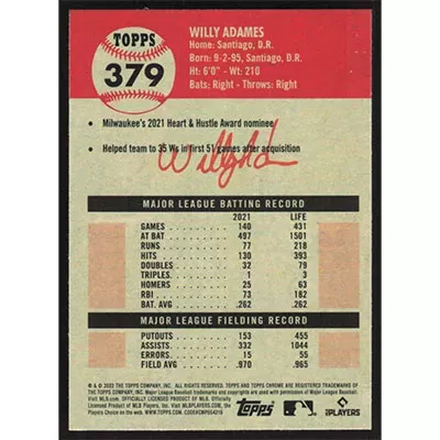 This is a 2022 Topps Chrome Platinum Anniversary Willy Adames baseball card. The card is #379 and pictures show condition.