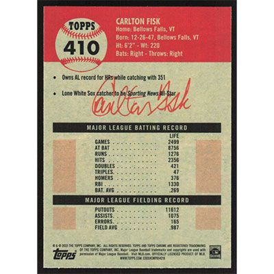 This is a 2022 Topps Chrome Platinum Anniversary Carlton Fisk baseball card. The card is #410 and pictures show condition.