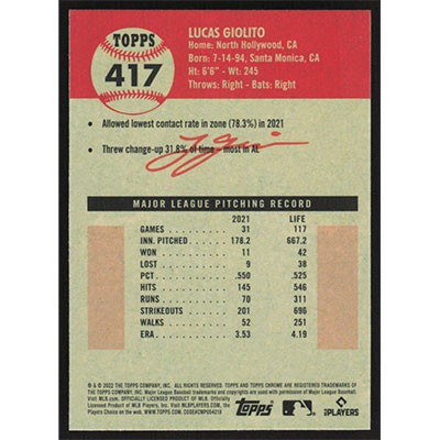 This is a 2022 Topps Chrome Platinum Anniversary Lucas Giolito baseball card. The card is #417 and pictures show condition.