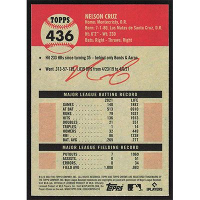 This is a 2022 Topps Chrome Platinum Anniversary Nelson Cruz baseball card. The card is #436 and pictures show condition.