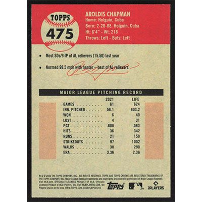 This is a 2022 Topps Chrome Platinum Anniversary Aroldis Chapman baseball card. The card is #475 and pictures show condition.