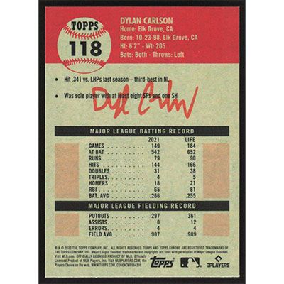 This is a 2022 Topps Chrome Platinum Anniversary Prism Refractors Dylan Carlson baseball card. The card is #118 and pictures show condition. Team(s): St. Louis Cardinals