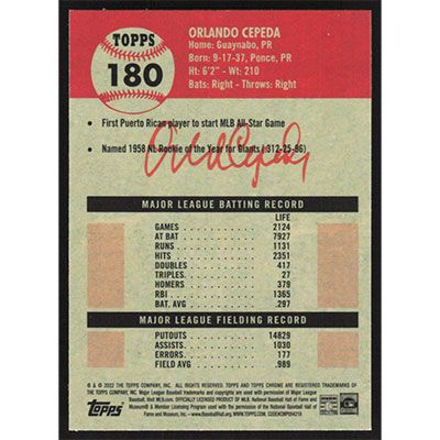 This is a 2022 Topps Chrome Platinum Anniversary Prism Refractors Orlando Cepeda baseball card. The card is #180 and pictures show condition. Team(s): San Francisco Giants