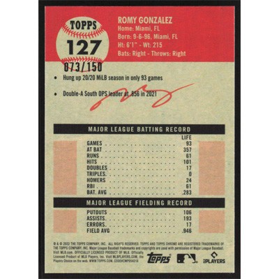 This is a 2022 Topps Chrome Platinum Anniversary Speckle Refractors Romy Gonzalez baseball card. The card is #127 and pictures show condition. This card is limited; #'d 073/150.