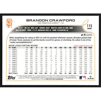 This is a 2022 Topps Chrome Prism Refractors Brandon Crawford baseball card. The card is #115 and pictures show condition. Team(s): San Francisco Giants