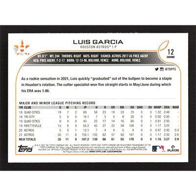 This is a 2022 Topps Chrome Prism Refractors Luis Garcia baseball card. The card is #12 and pictures show condition.