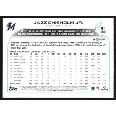 This is a 2022 Topps Chrome Prism Refractors Jazz Chisholm Jr. baseball card. The card is #91 and pictures show condition.