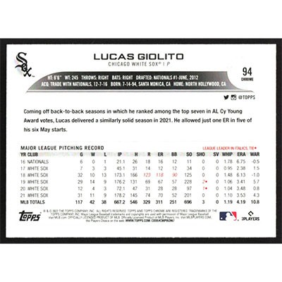 This is a 2022 Topps Chrome Prism Refractors Lucas Giolito baseball card. The card is #94 and pictures show condition.