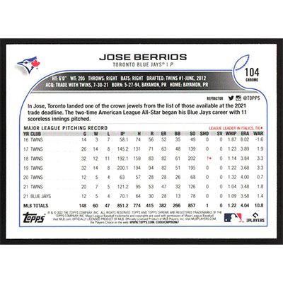 This is a 2022 Topps Chrome Refractors Jose Berrios baseball card. The card is #104 and pictures show condition.