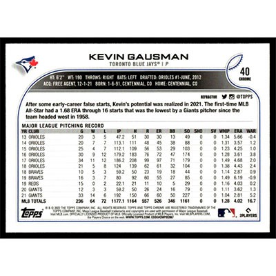 This is a 2022 Topps Chrome Refractors Kevin Gausman baseball card. The card is #40 and pictures show condition.