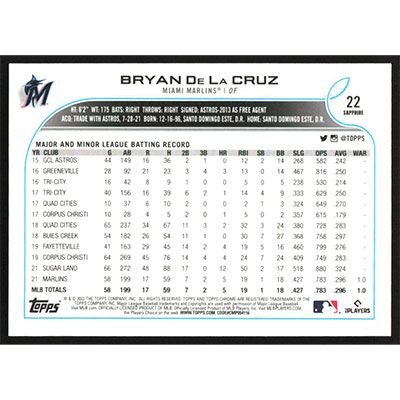 This is a 2022 Topps Chrome Sapphire Bryan De La Cruz baseball card. The card is #22 and pictures show condition. Team(s): Miami Marlins Rookie Card (RC)