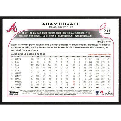 This is a 2022 Topps Chrome Sapphire Adam Duvall baseball card. The card is #279 and pictures show condition.