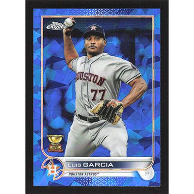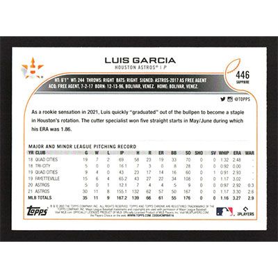 This is a 2022 Topps Chrome Sapphire Luis Garcia baseball card. The card is #446 and pictures show condition.