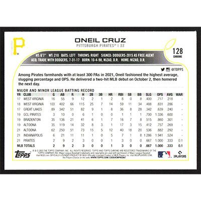 This is a 2022 Topps Chrome Sepia Refractors Oneil Cruz baseball card. The card is #128 and pictures show condition. Team(s): Pittsburgh Pirates Rookie Card (RC)