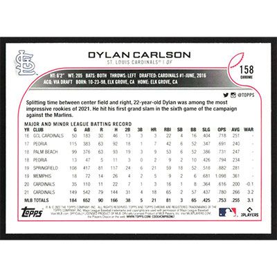 This is a 2022 Topps Chrome Sepia Refractors Dylan Carlson baseball card. The card is #158 and pictures show condition.