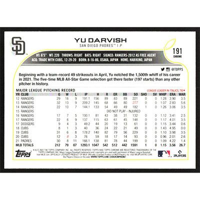 This is a 2022 Topps Chrome Sepia Refractors Yu Darvish baseball card. The card is #191 and pictures show condition.