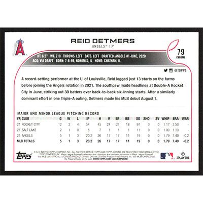 This is a 2022 Topps Chrome Sepia Refractors Reid Detmers baseball card. The card is #79 and pictures show condition. Team(s): Los Angeles Angels Rookie Card (RC)