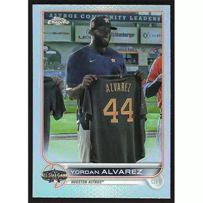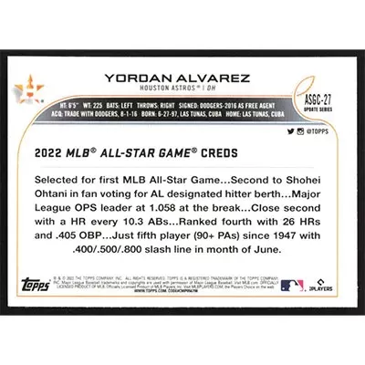 This is a 2022 Topps Chrome Update '22 All-Star Game Yordan Alvarez baseball card. The card is #ASGC-27 and pictures show condition. Team(s): Houston Astros