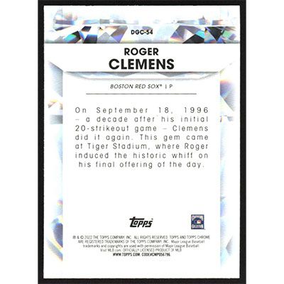 This is a 2022 Topps Chrome Update Diamond Greats Roger Clemens baseball card. The card is #DGC-54 and pictures show condition.