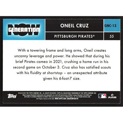 This is a 2022 Topps Chrome Update Generation Now Oneil Cruz baseball card. The card is #GNC-13 and pictures show condition. Team(s): Pittsburgh Pirates Rookie Card (RC)